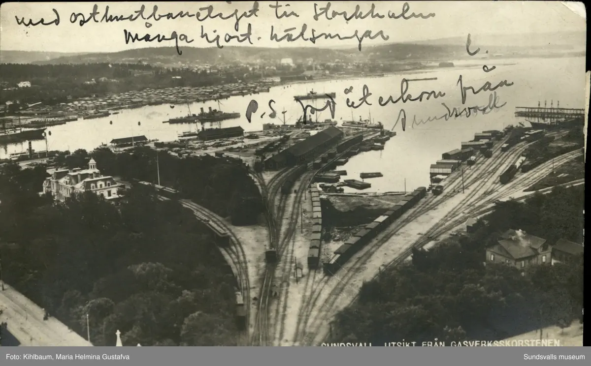 Vykort med motiv över spårområdet i hamnen i Sundsvall sett från Gasverkets skorsten. Järnvägsbassängen till höger.