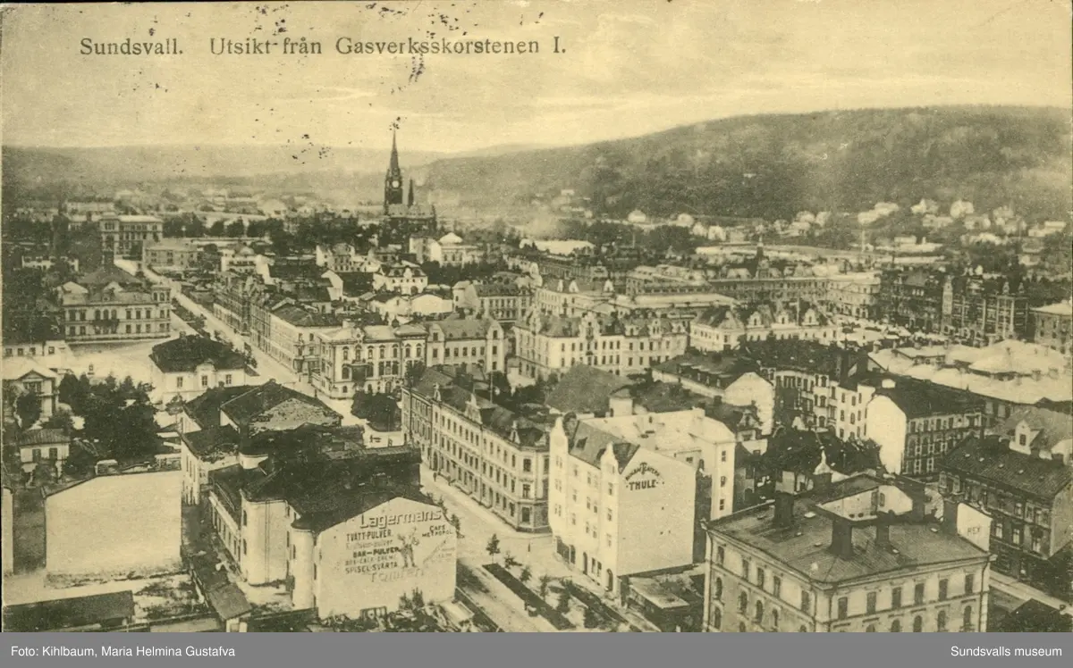 Vykort med motiv över Sundsvall. "Utsikt från Gasverksskortstenen I".