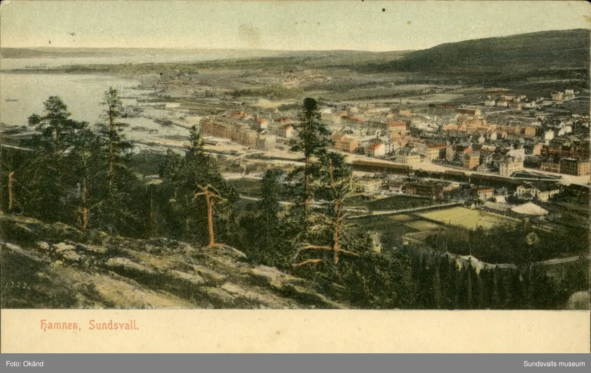 Vykort med motiv över Hamnen i Sundsvall sedd från Norra berget.