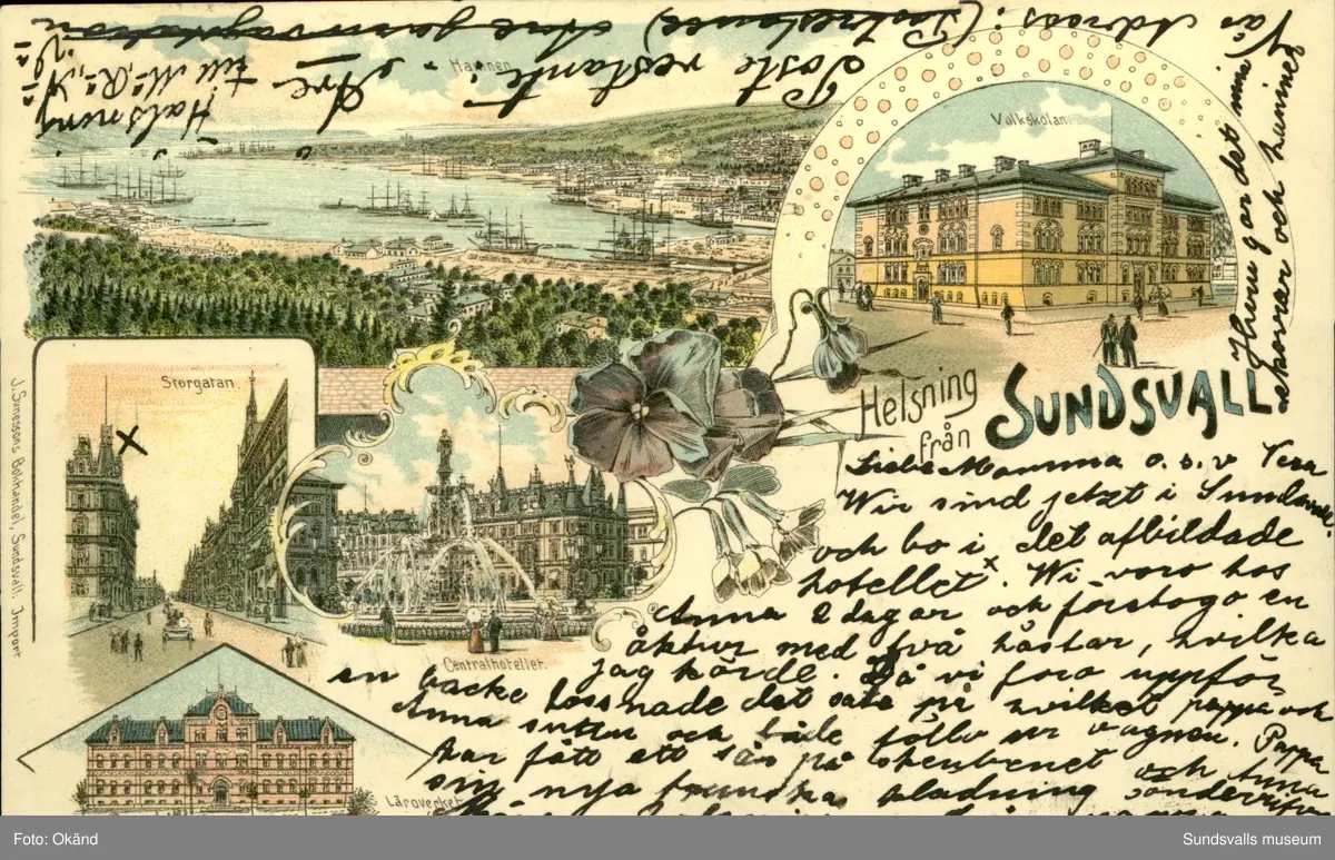 Vykort med motiv över Hamnen, Folkskolan, Storgatan, Centralhotellet och Läroverket för flickor i Sundsvall.