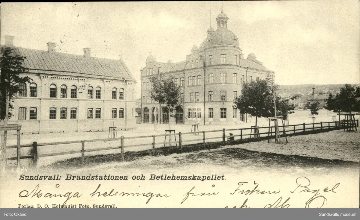 Vykort med motiv över brandstationen och Betlehemskapellet i Sundsvall.