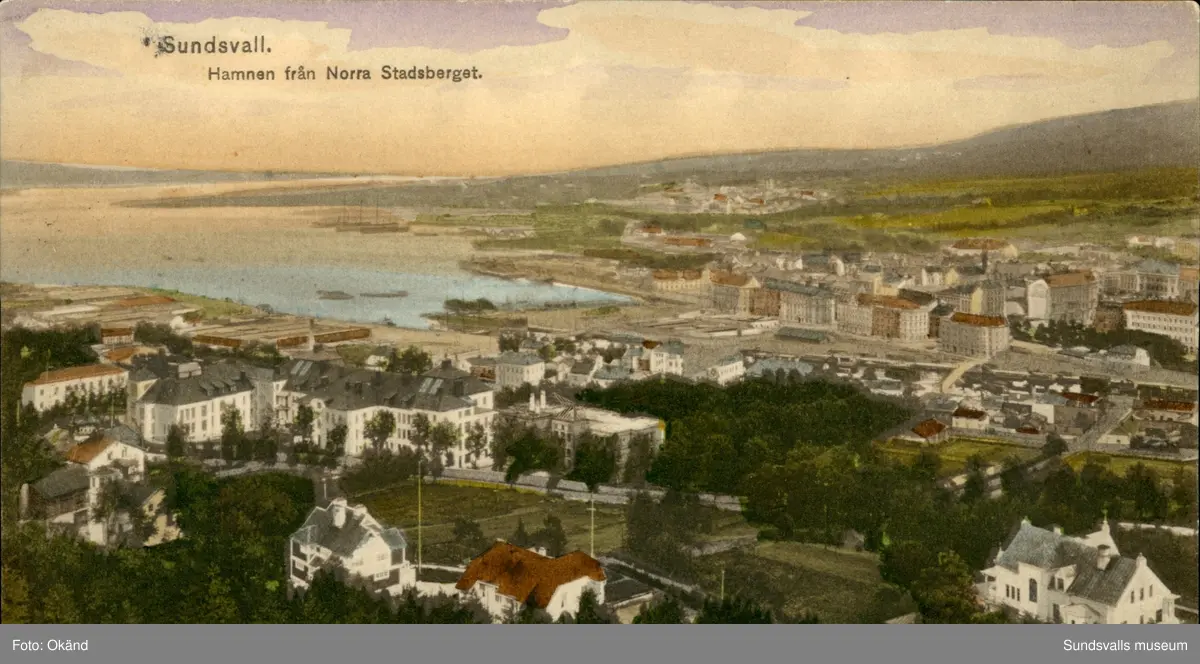 Vykort med motiv över Hamnen i Sundsvall sedd från Norra berget.