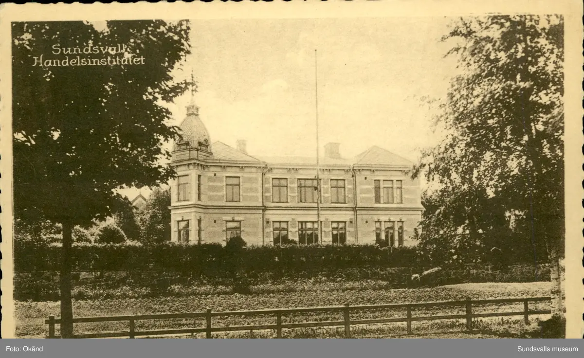 Vykort med motiv över Handelsinstitutet i Sundsvall.