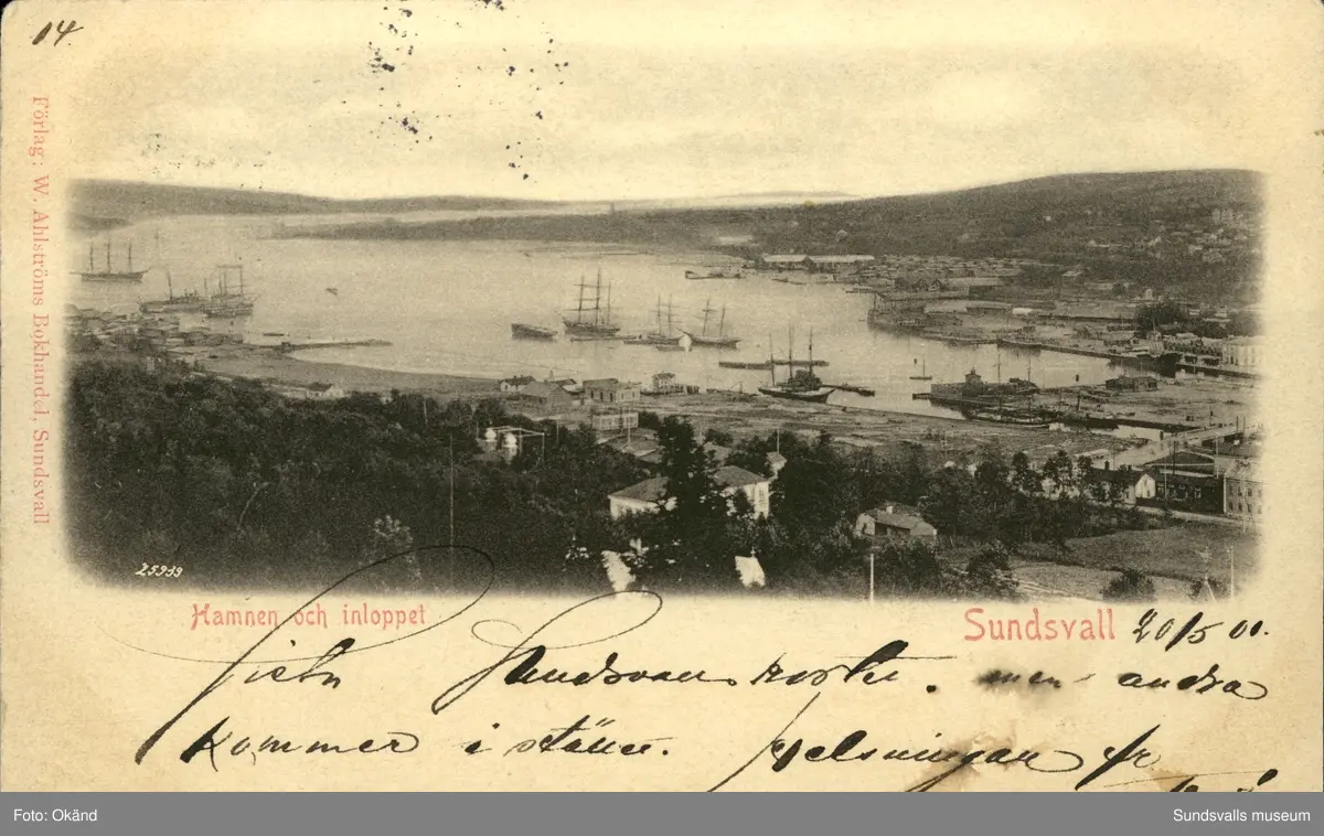 Vykort med motiv över Hamnen och inloppet i Sundsvall.