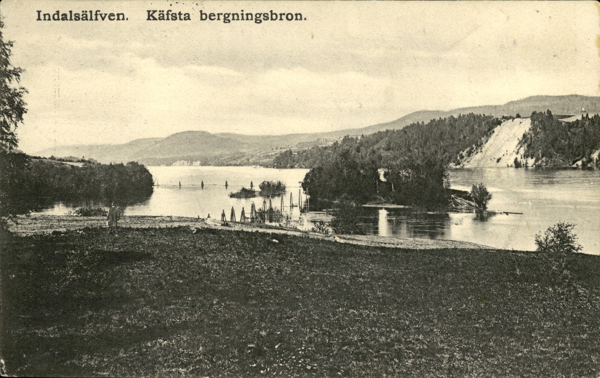 Vykort med motiv av Kävsta bergningsbom vid Indalsälven.