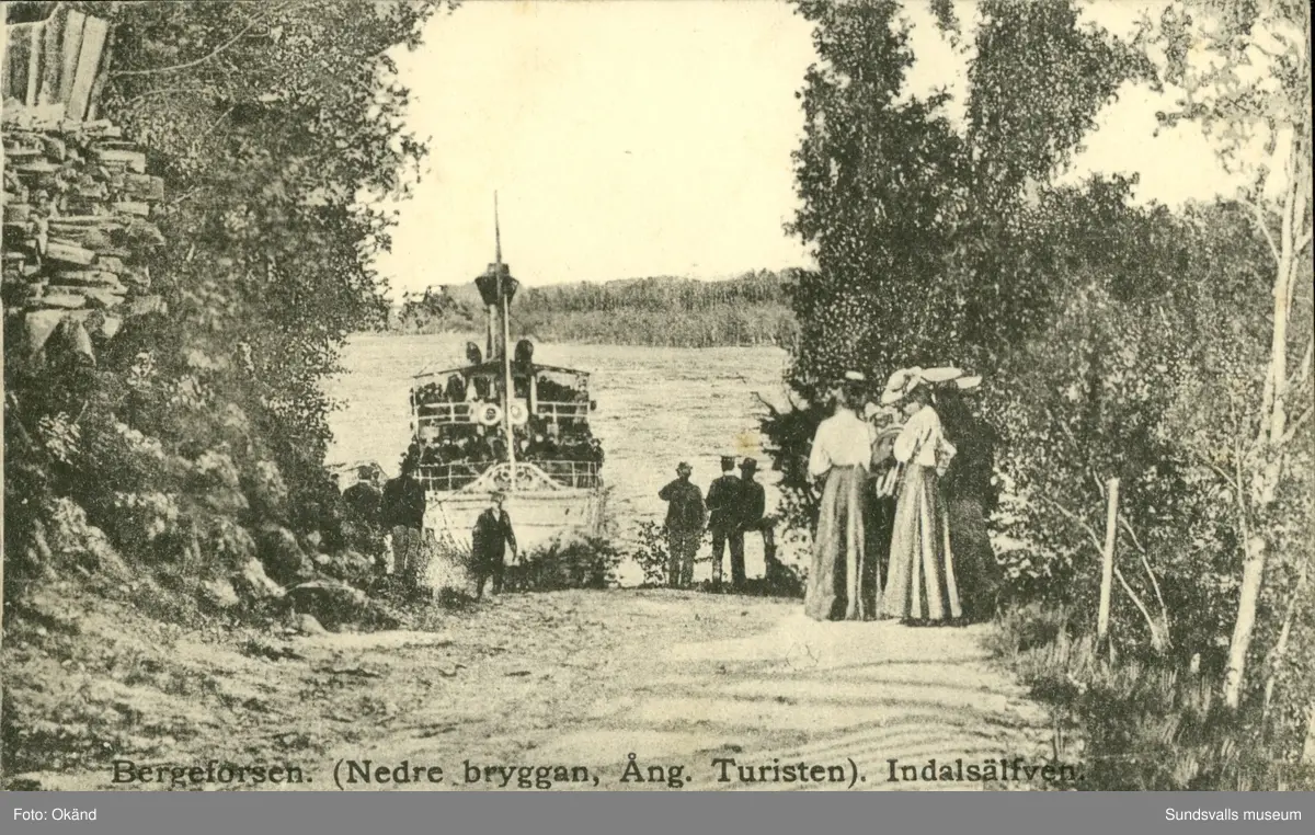 Vykort med motiv över den nedre bryggan i Bergeforsen och ångbåten Turisten som trafikerade Indalsälven.