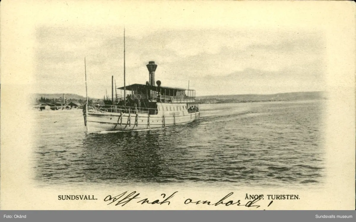 Vykort med motiv av ångbåten Turisten som trafikerade farlederna i Sundsvall.