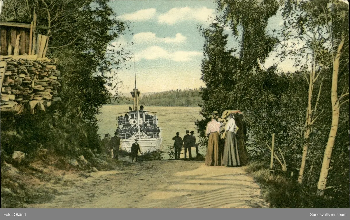 Vykort med motiv över den nedre bryggan i Bergeforsen och ångbåten Turisten som trafikerade Indalsälven.