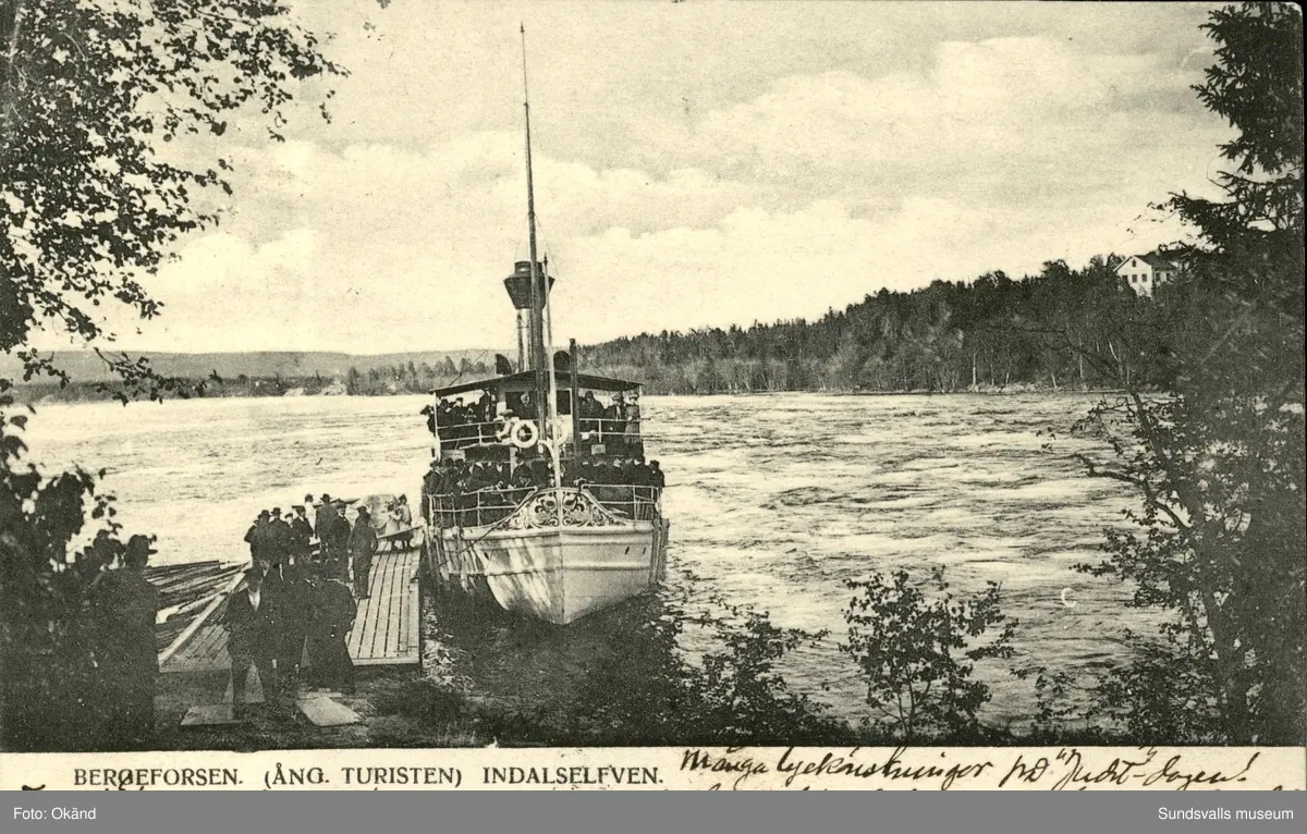Vykort med motiv över den nedre bryggan i Bergeforsen och ångbåten Turisten som trafikerade Indalsälven.