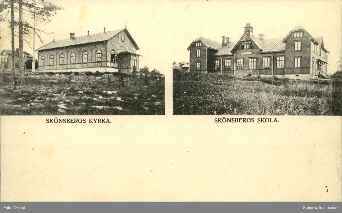 Vykort med motiv över kyrkan och skolan i Skönsberg.