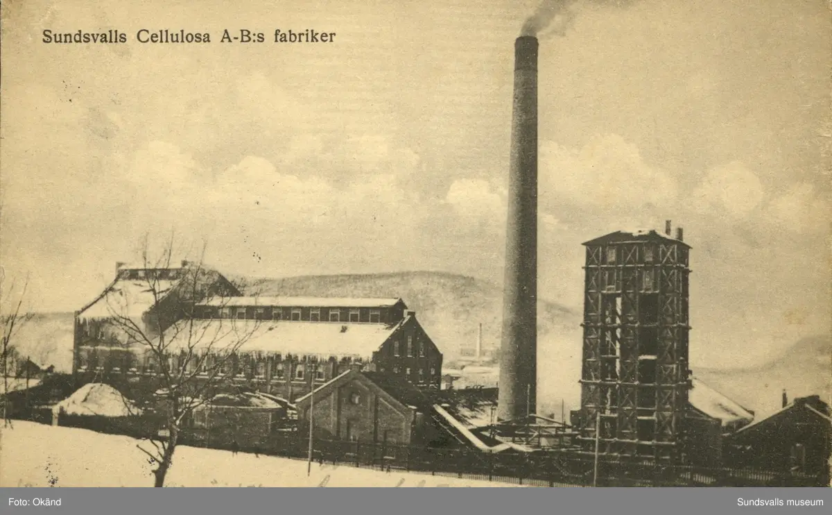 Vykort med motiv över Celluslosa AB´s fabrik vid Svartvik utanför Sundsvall.