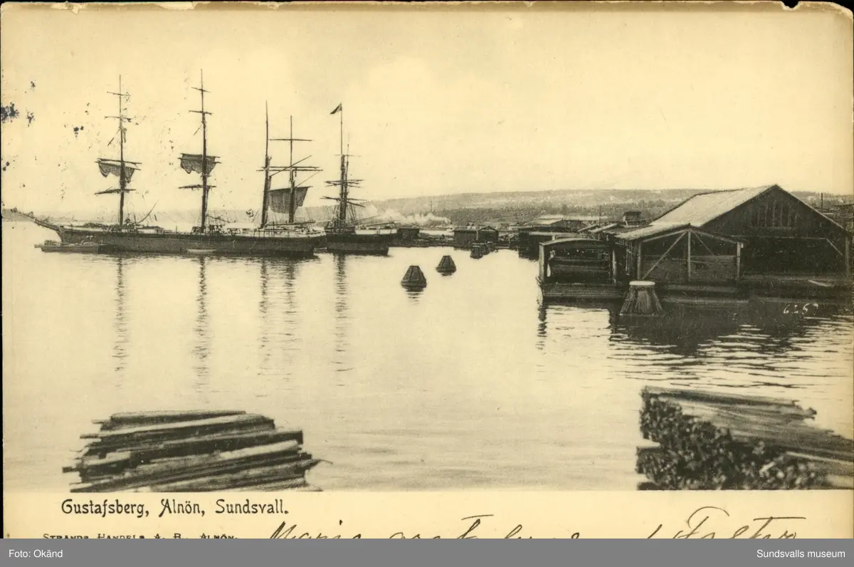 Vykort med motiv över Gustafsbergs ångsåg på Alnön.