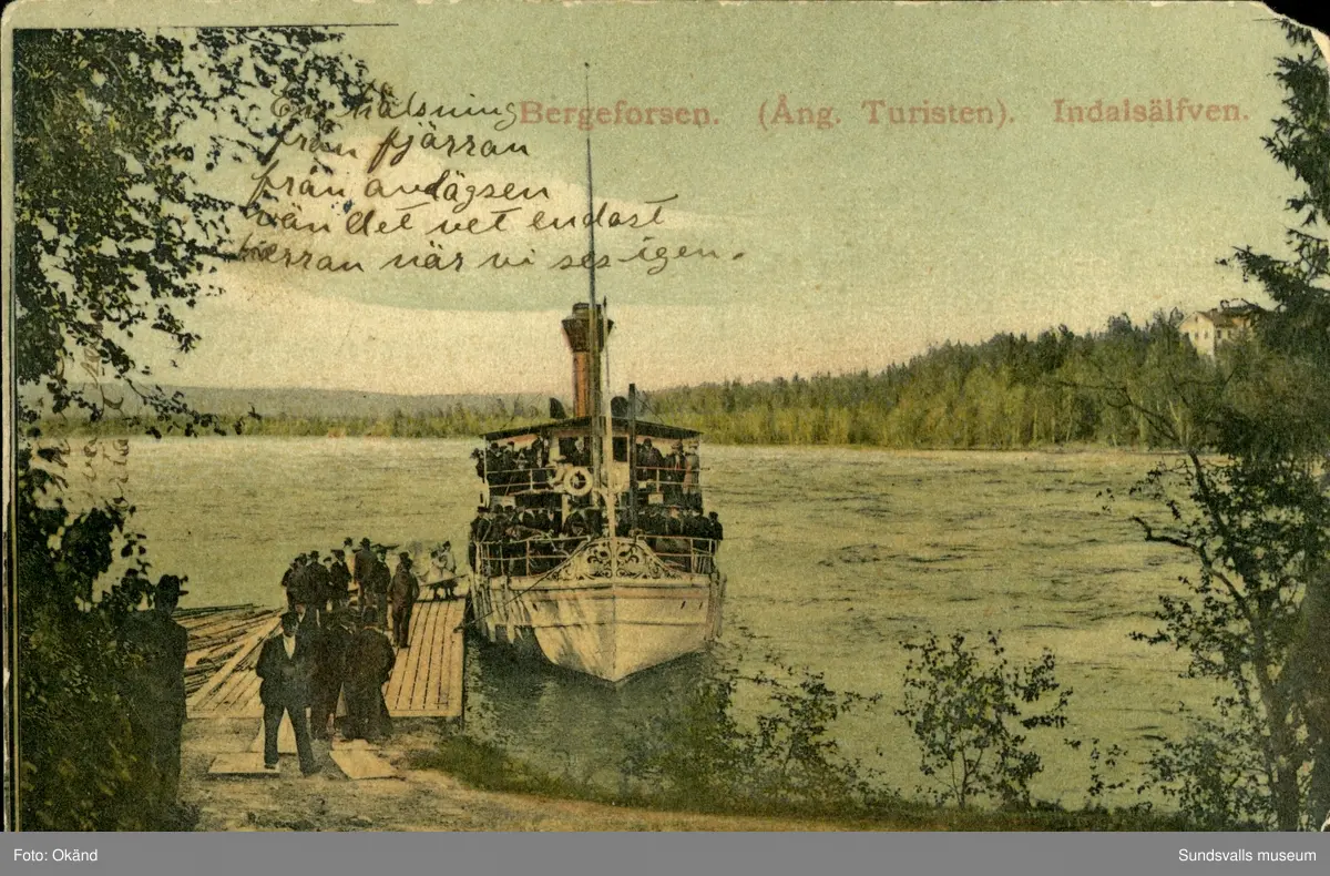 Vykort med motiv över den nedre bryggan i Bergeforsen och ångbåten Turisten som trafikerade Indalsälven.