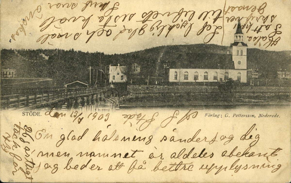 Vykort med motiv av bron över sjön och kyrkan i Stöde.