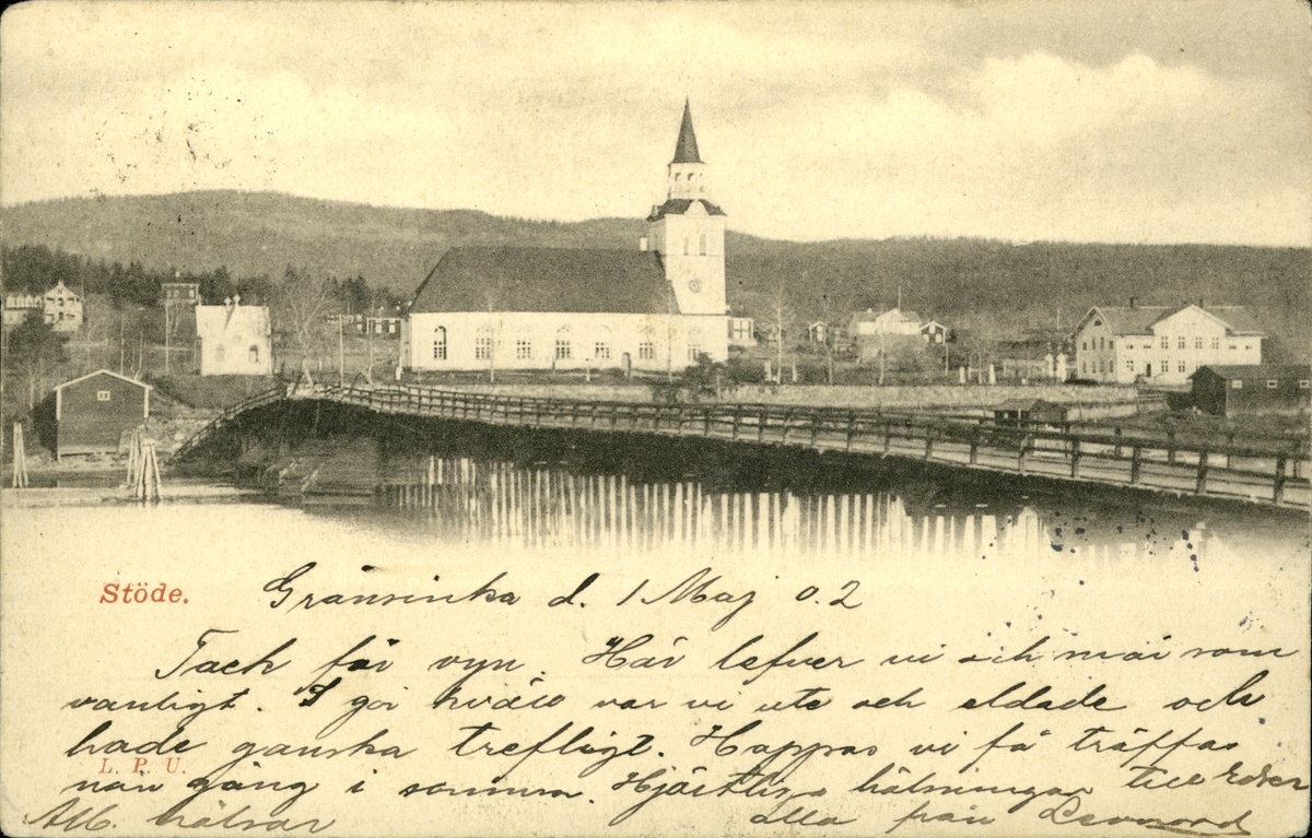 Titel: Vykort med motiv av bron över sjön och kyrkan i Stöde.