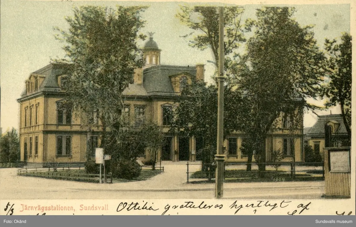 Vykort med motiv över järnvägsstationen i Sundsvall.