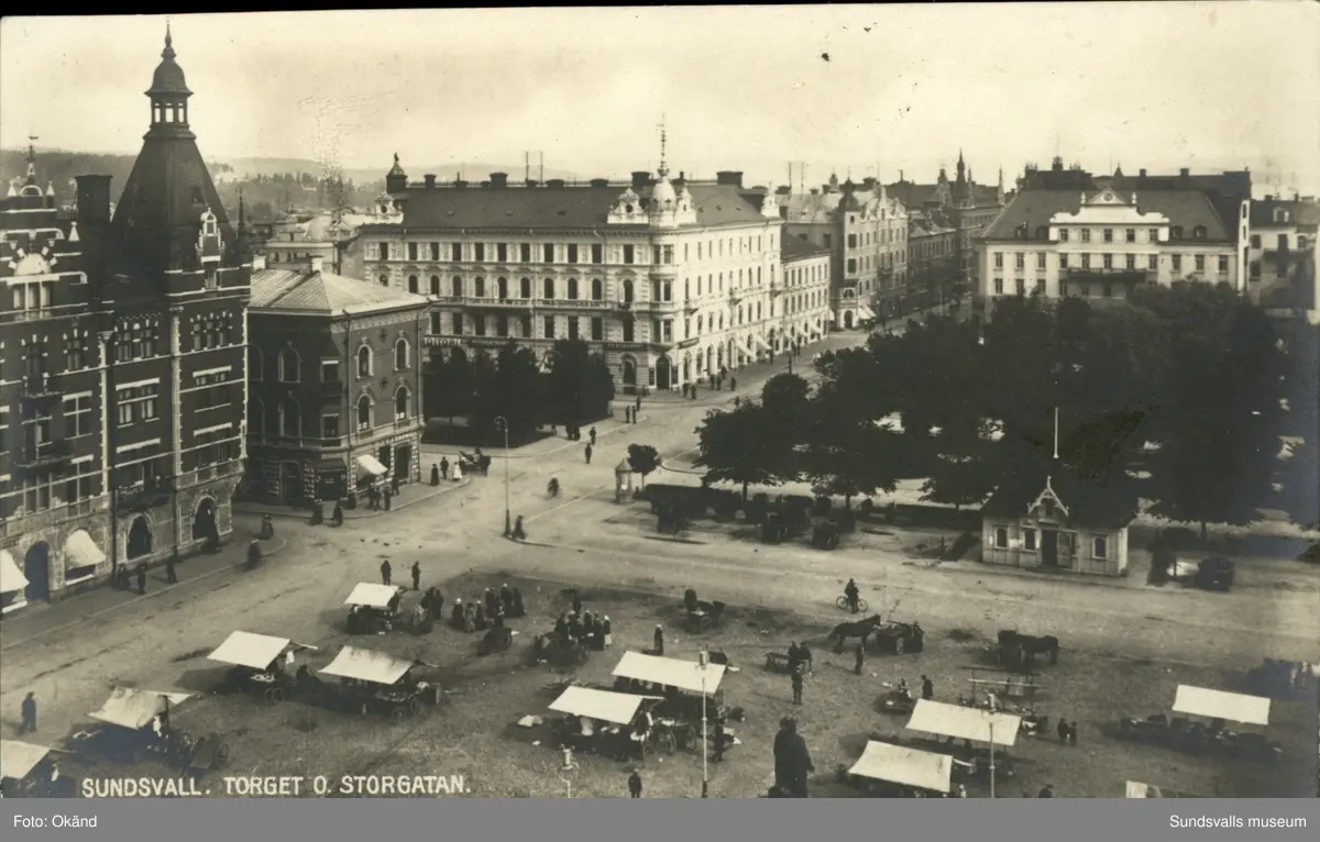 Vykort med motiv över Stora torget och Storgatan i Sundsvall.