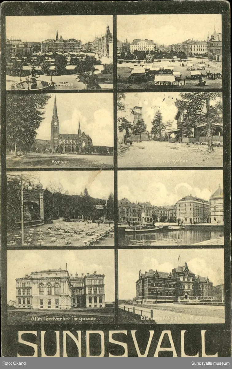 Vykort med motiv över Vängåvan, Stora torget, Kyrkan, Turisthyddan, Tivoli, Hamnen, Allmänna läroverket för gossar och Elementärskolan för flickor i Sundsvall.