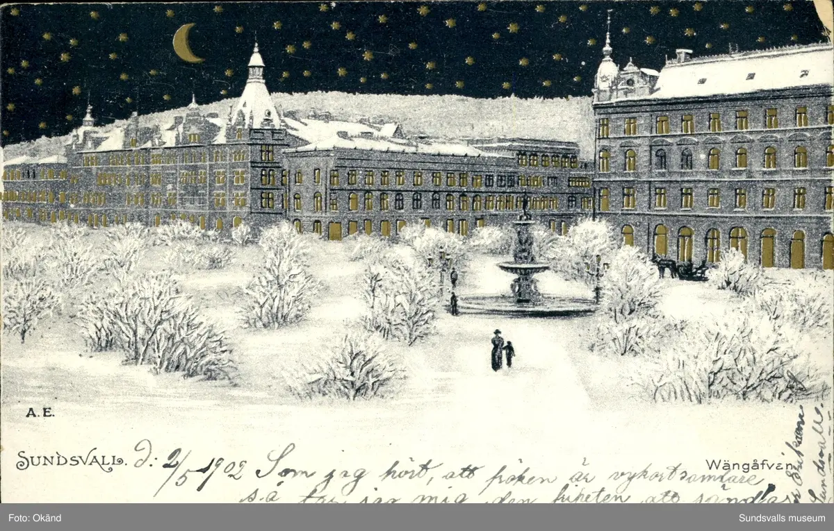 Vykort med vintermotiv över Vängåvan i Sundsvall.