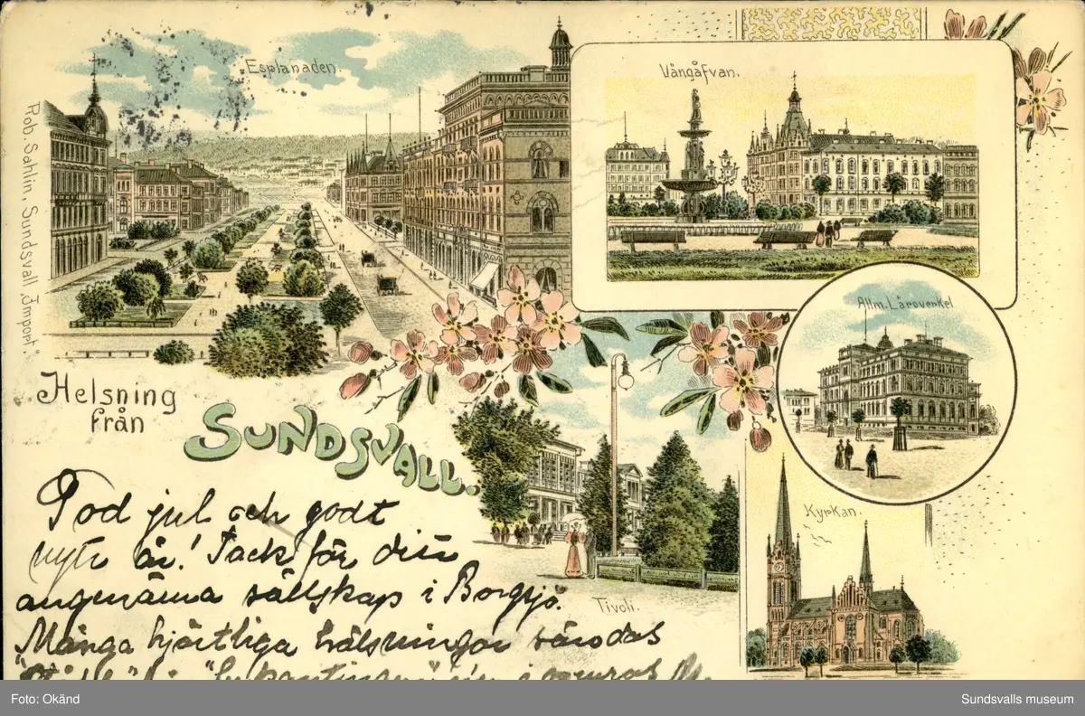 Vykort med motiv över Esplanaden, Vängåvan, Tivoli, Allmänna Läroverket och Kyrkan i Sundsvall.