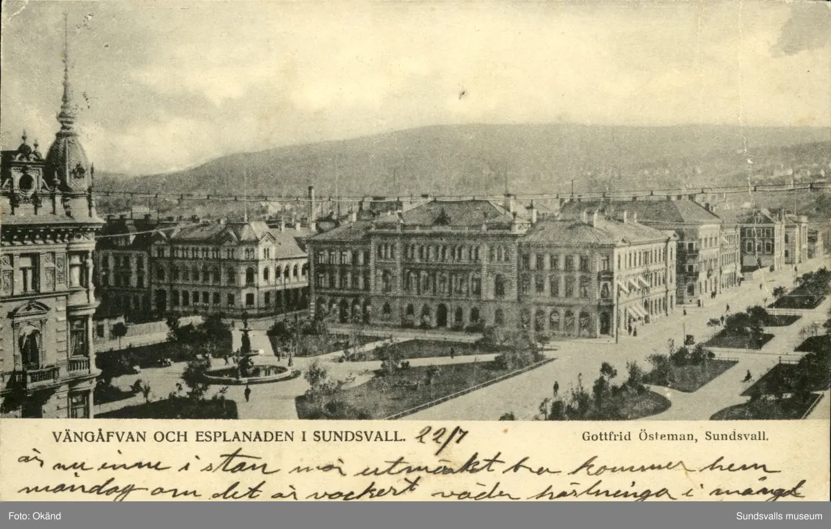 Vykort med motiv över Vängåvan och Esplanaden i Sundsvall.