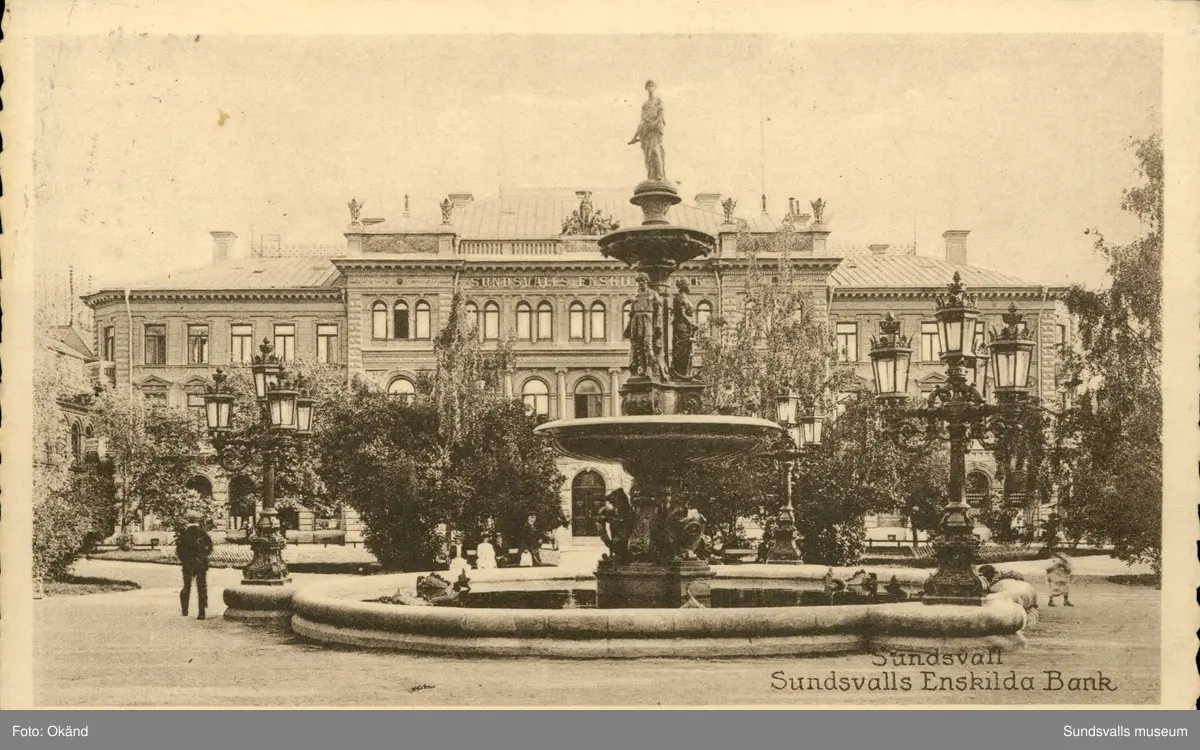 Vykort med motiv över Sundsvalls Enskilda bank och Vängåvan.
