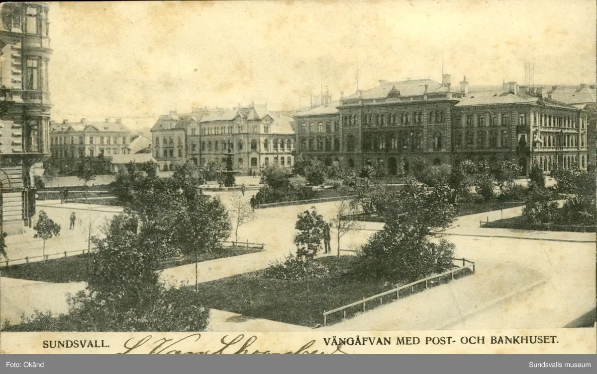 Vykort med motiv över Vängåvan och post- och bankhuset i Sundsvall.