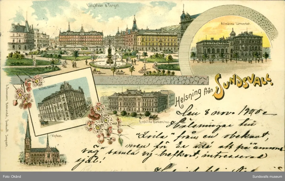 Vykort med motiv över Vängåvan och Torget, Allmänna läroverket, Hotell Knaust, kyrkan och Enskilda bankens hus i Sundsvall.