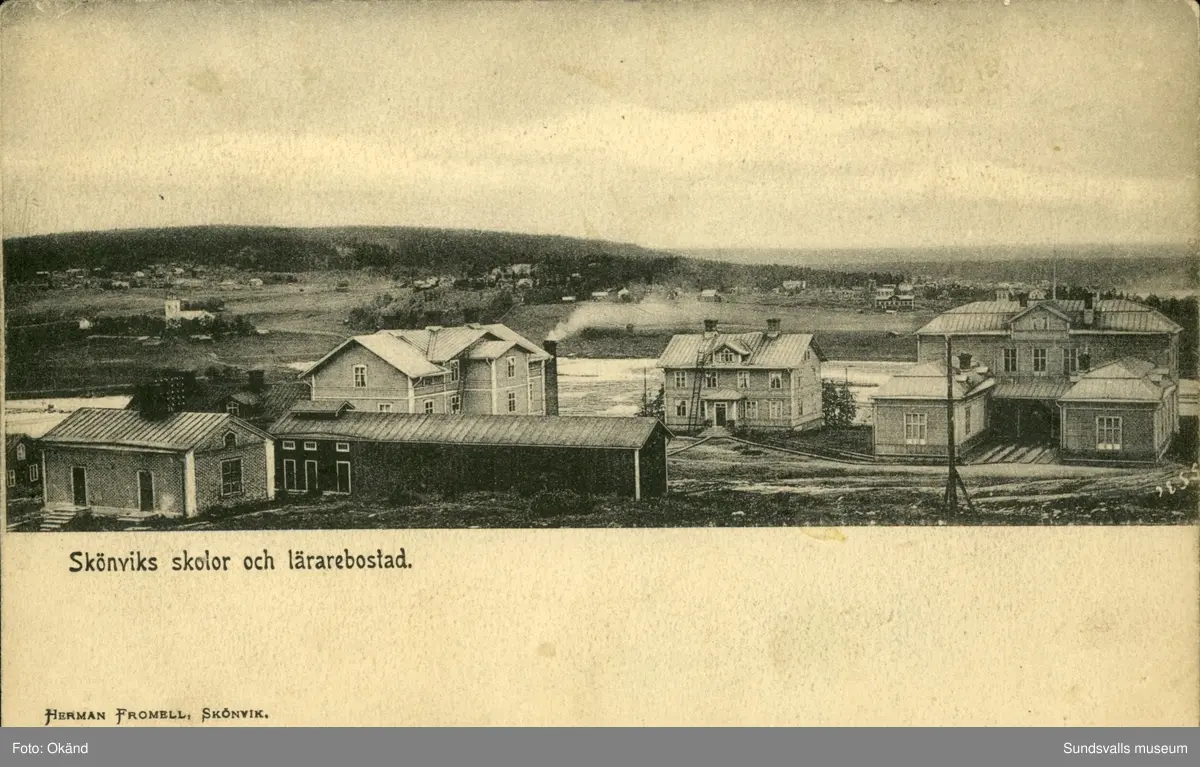 Vykort med motiv över skolorna och lärarbostaden i Skönvik.