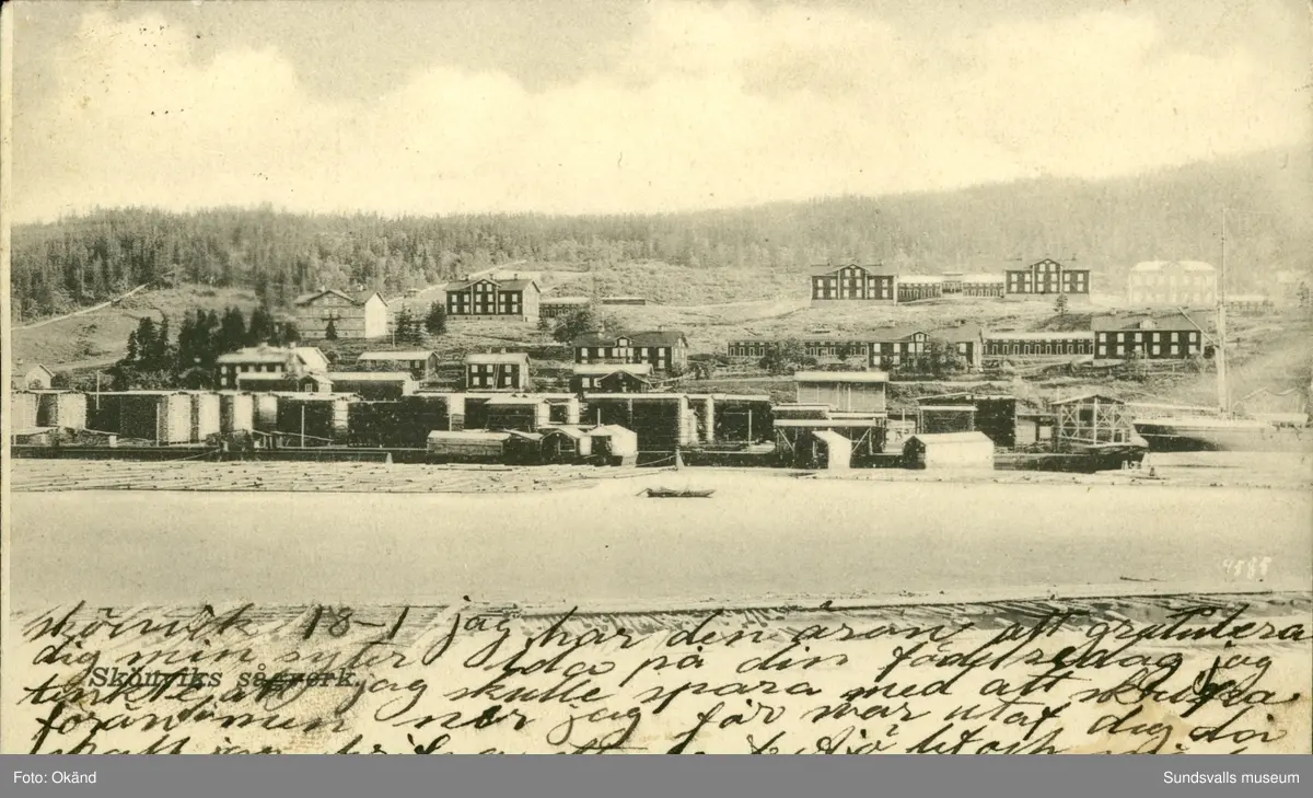 Vykort med motiv över sågverket och kyrkan i Skönvik.