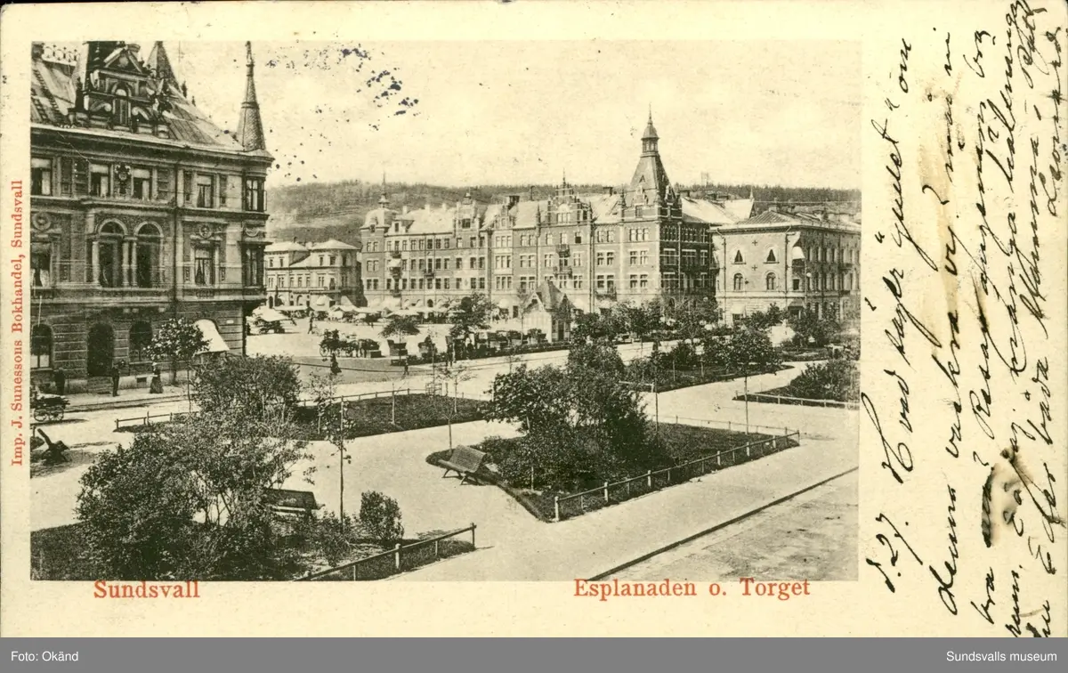 Vykort med motiv över Esplanaden och Stora torget i Sundsvall.