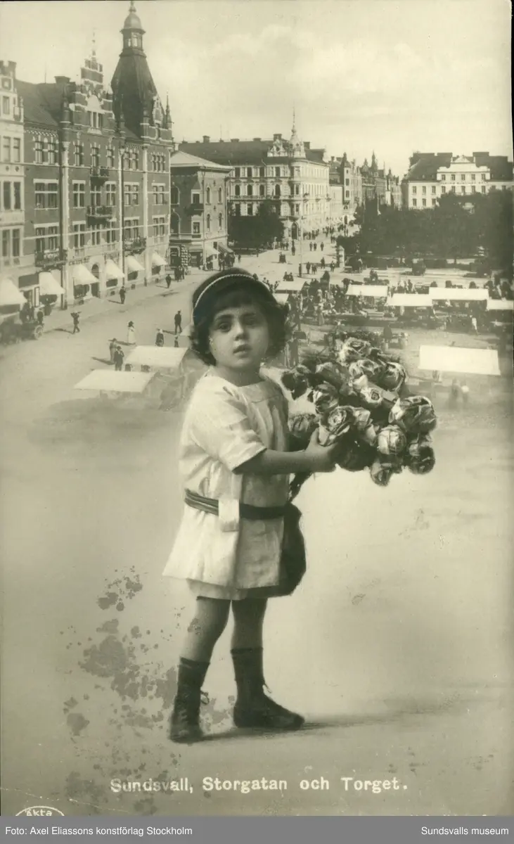 Vykort med ett motiv av en liten pojke med blomsterbukett med Storgatan och Stora torget i bakgrunden.