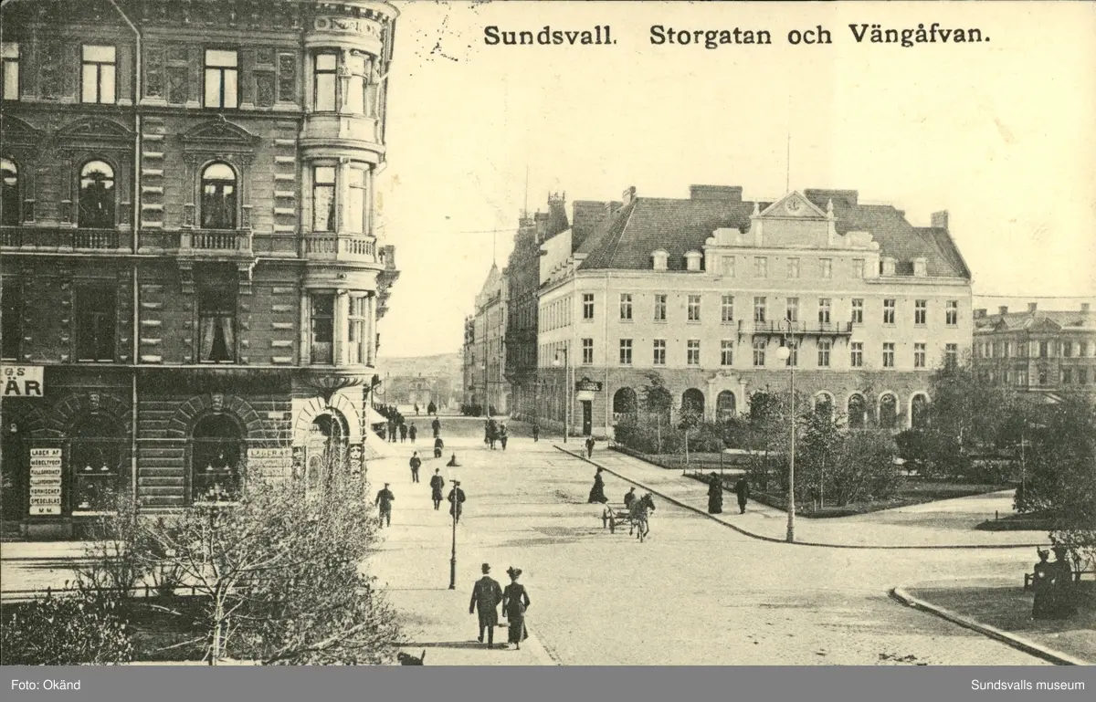 Vykort med motiv över Storgatan och Vängåvan i Sundsvall.