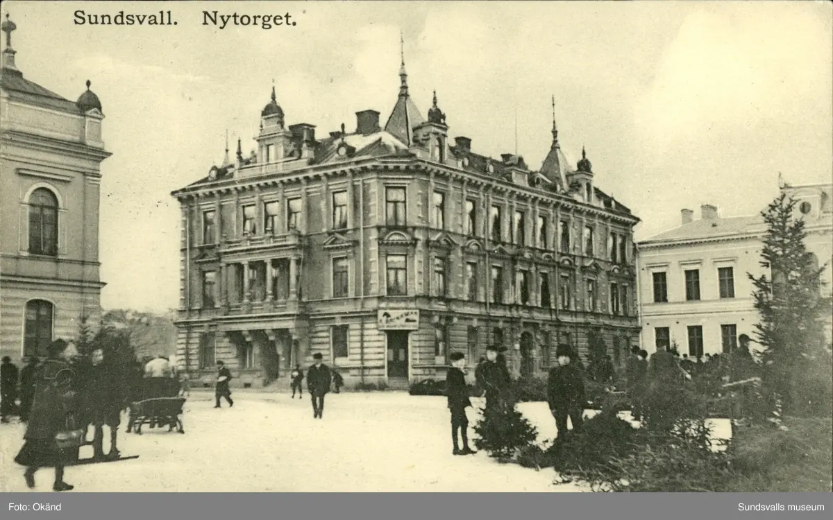 Vykort med motiv över julgransförsäljning på Nytorget i Sundsvall.