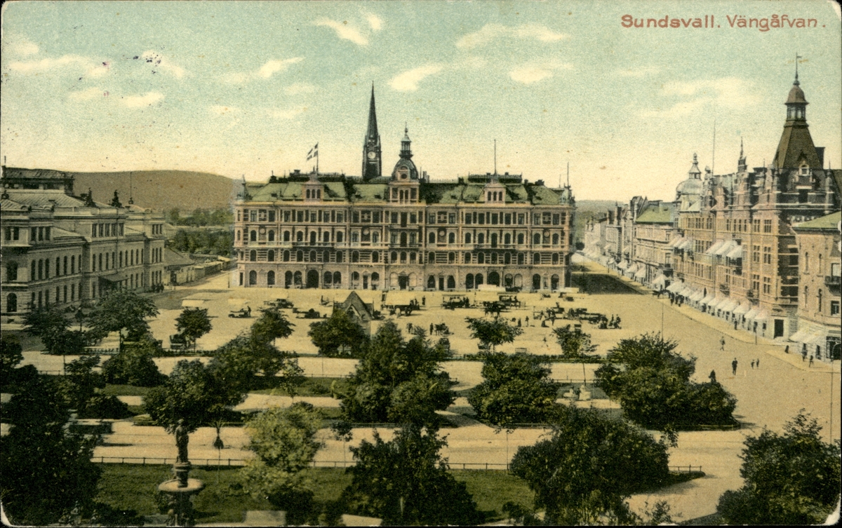 Vykort med motiv över Vängåvan och Stora torget i Sundsvall.