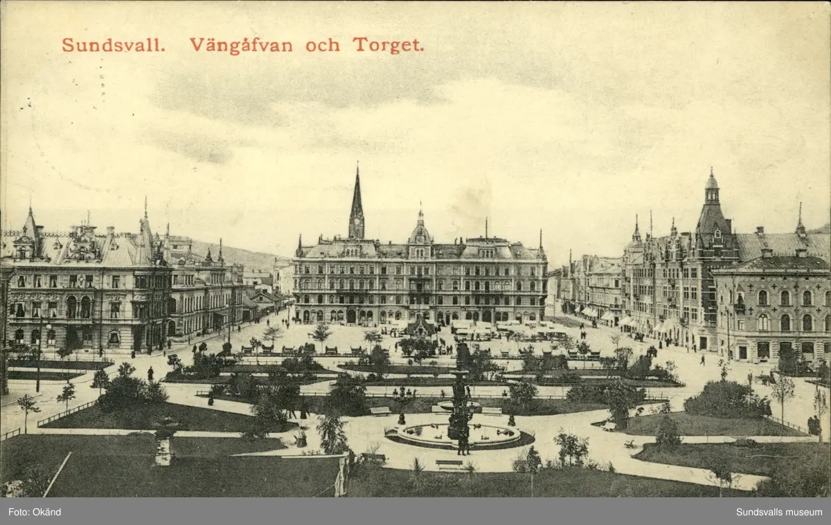 Vykort med motiv över Vängåvan och Stora torget i Sundsvall.