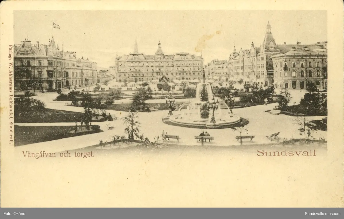 Vykort med motiv över Vängåvan och Stora torget i Sundsvall.