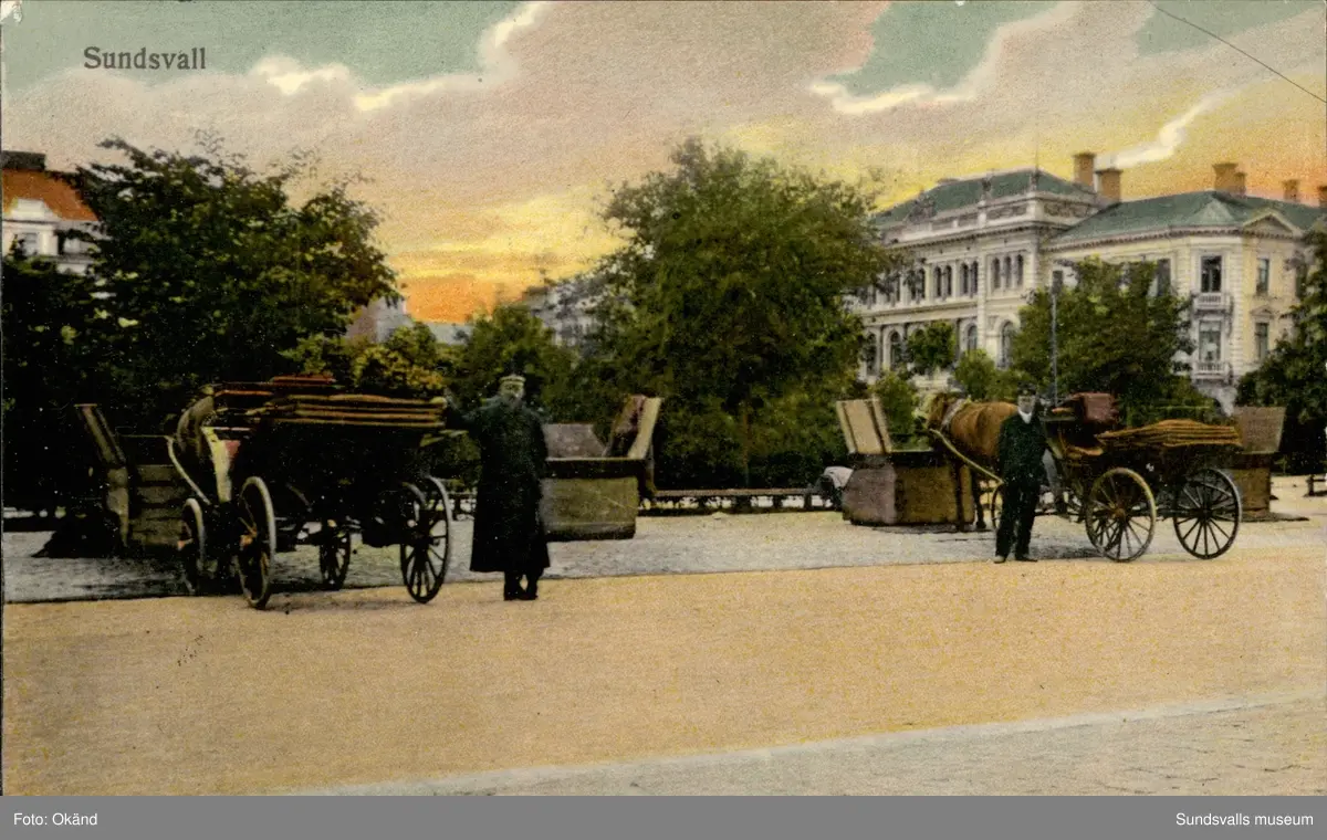 Vykort med motiv av två kuskar med ekipage på Stora torget i Sundsvall.