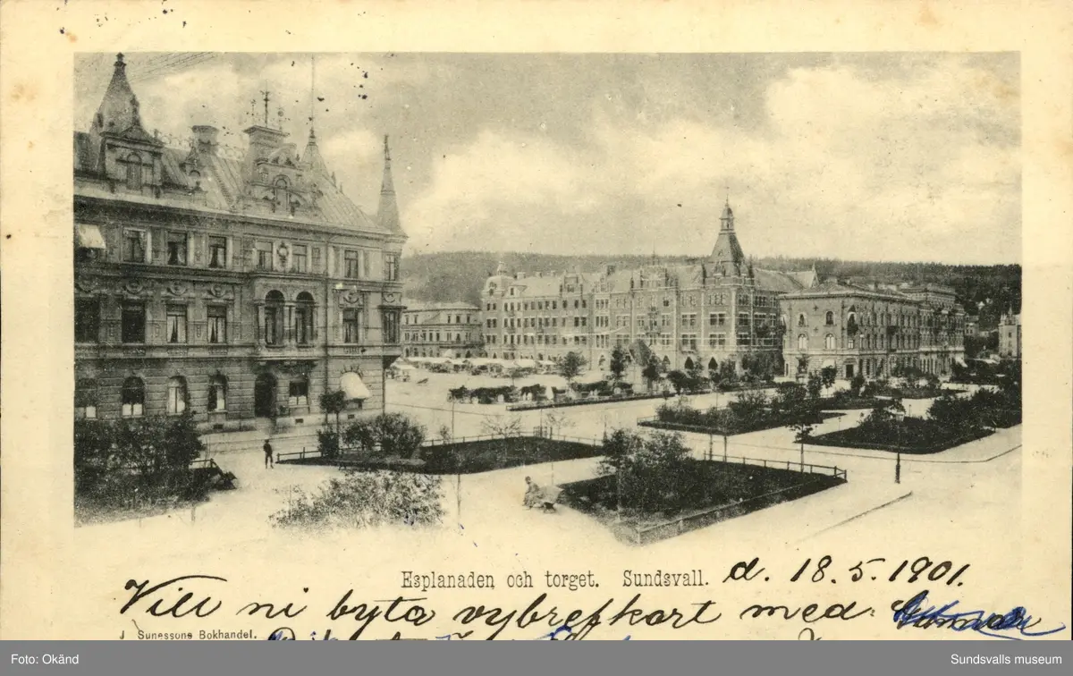 Vykort med motiv över Stora torget och Esplanaden i Sundsvall.
