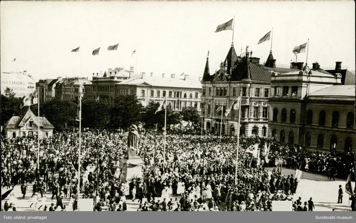 Titel: Vykort med motiv över Stora torget och invigningen av Gustav Adolfs staty i Sundsvall.