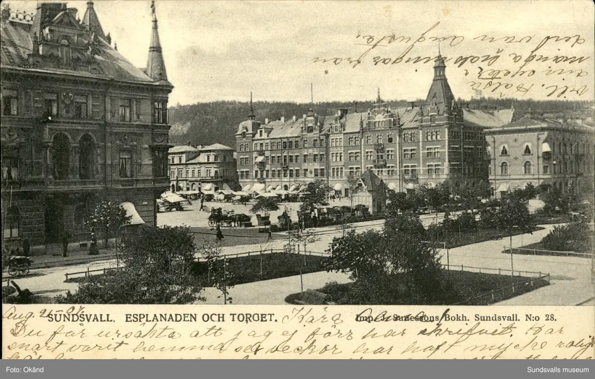 Vykort med motiv över Esplanaden och Stora torget i Sundsvall.
