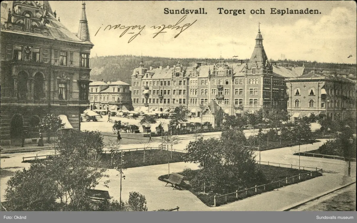 Titel: Vykort med motiv över Esplanaden och Stora torget i Sundsvall.