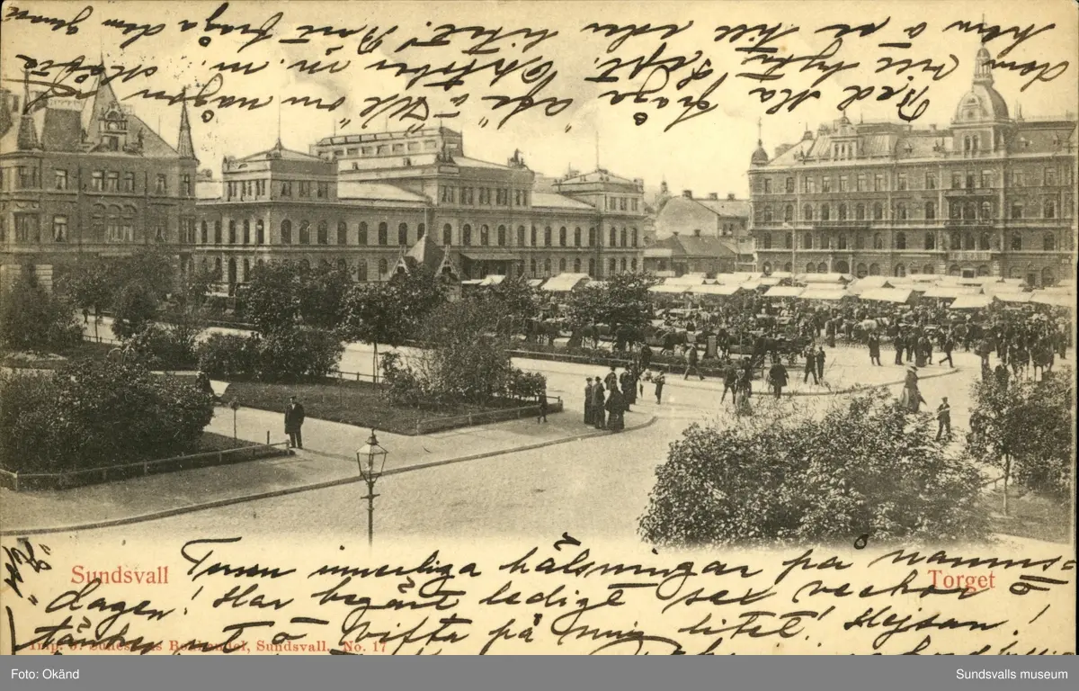 Vykort med motiv över Stora torget i Sundsvall.