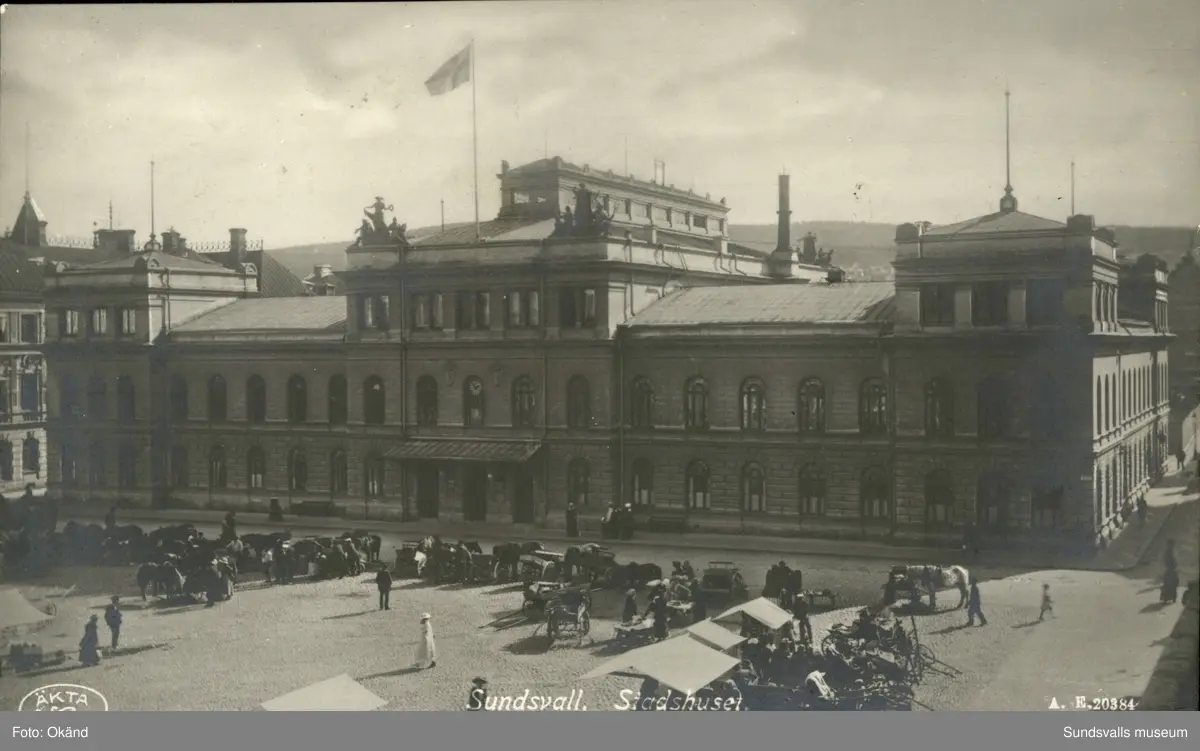 Vykort med motiv över Stora torget och Stadshuset i Sundsvall.