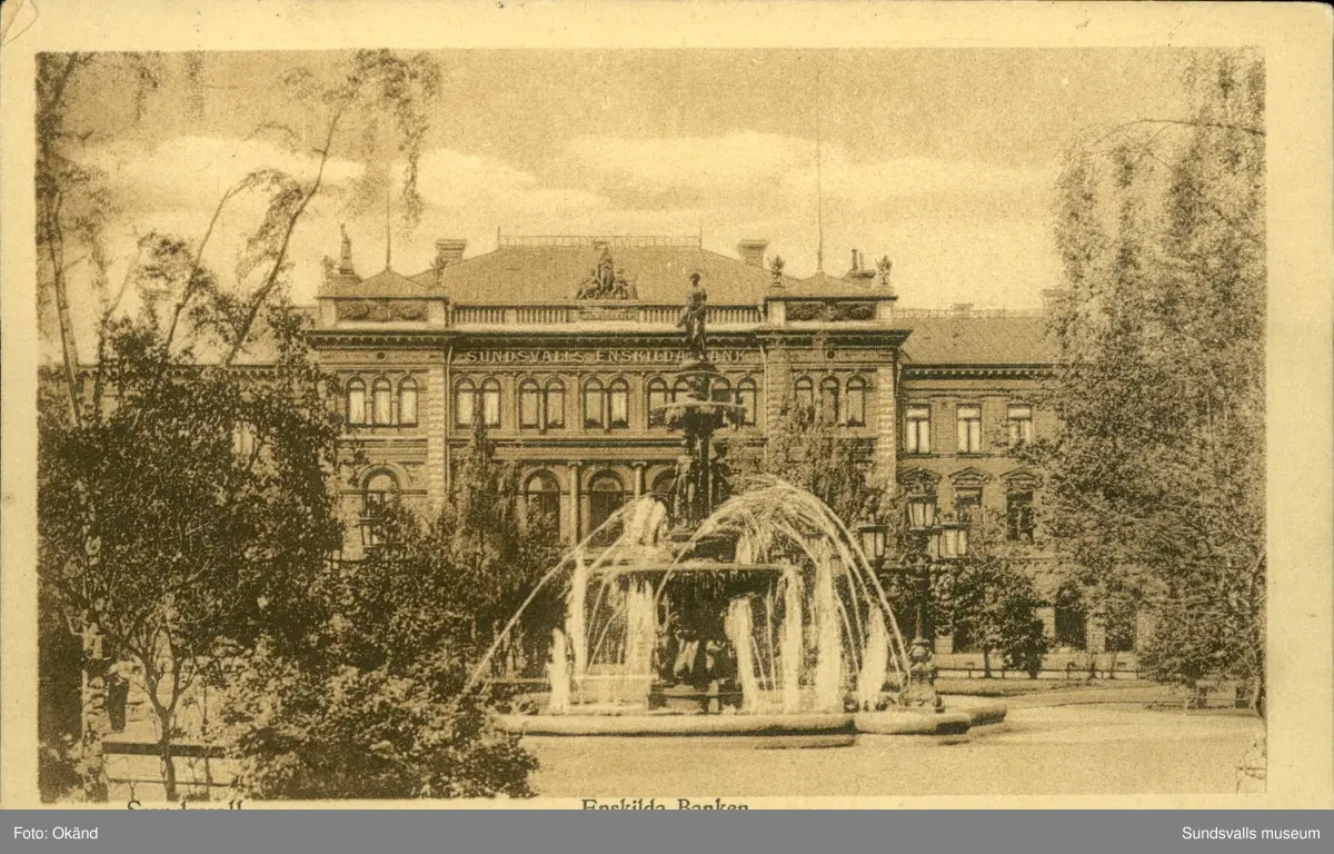 Vykort med motiv över Enskilda banken och Vängåvan i Sundsvall.