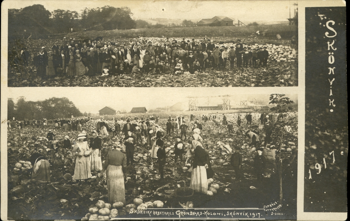 Vykort med motiv över de sågverksanställdas koloniodlingar vid Skönvik.