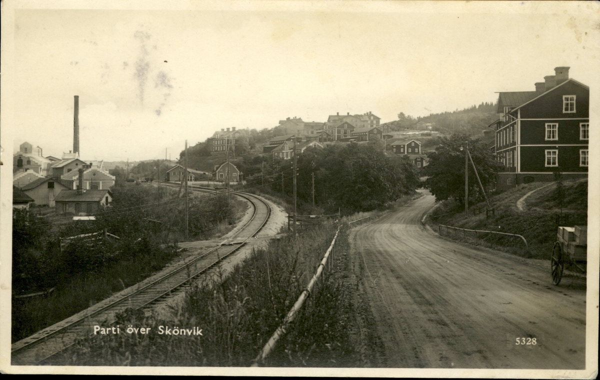 Vykort med motiv över parti av sågverkssamhället Skönvik.