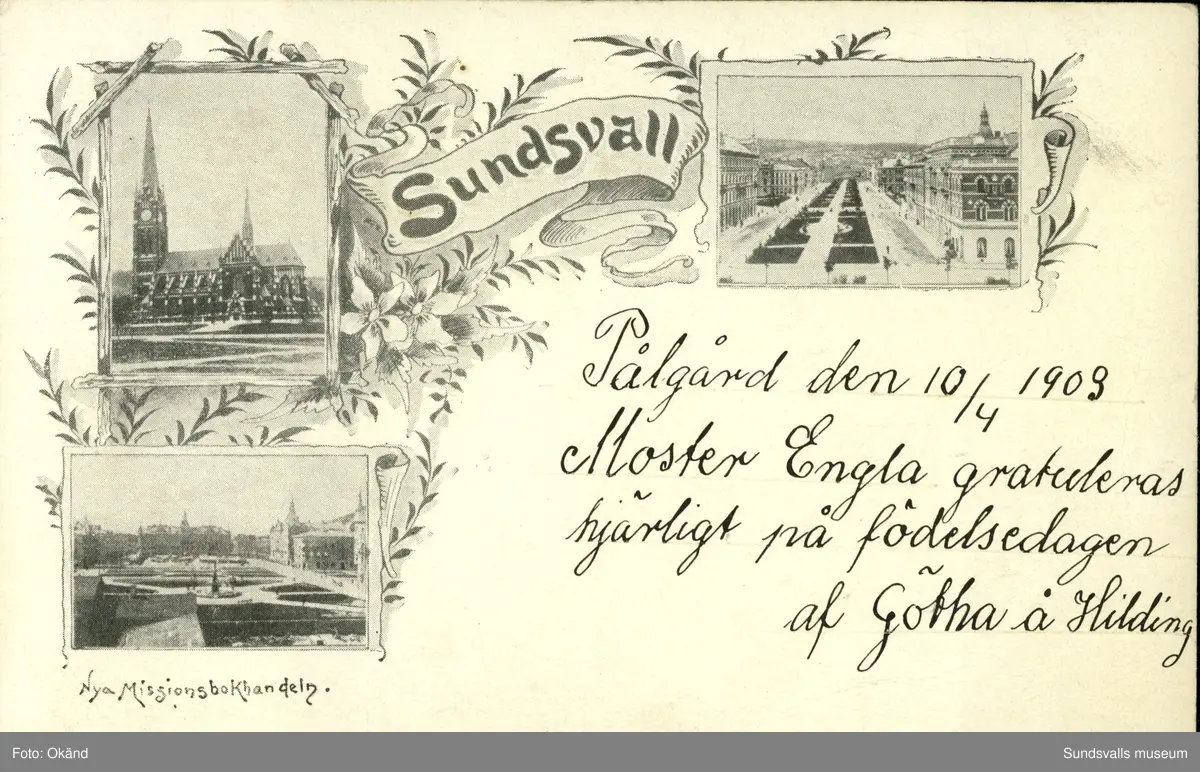 Vykort med motiv infällda av Kyrkan, Esplanaden och Vängåvan i Sundsvall.