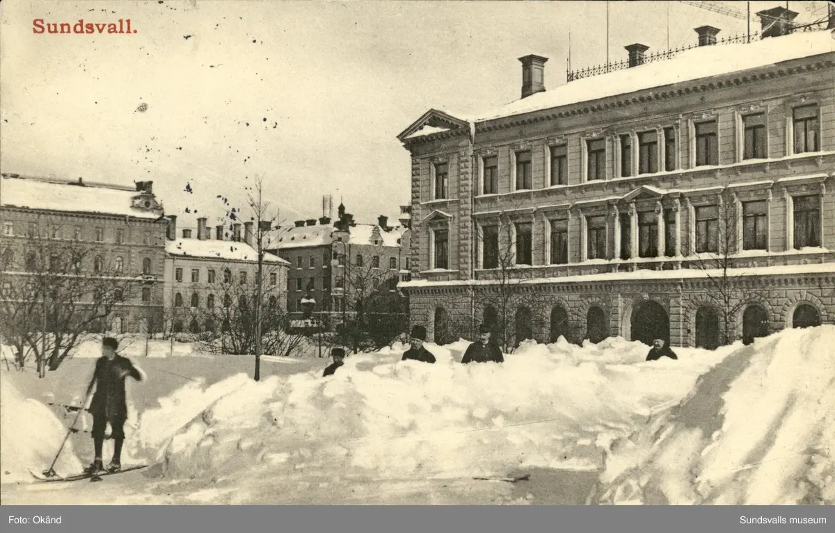 Vykort med vintermotiv över Esplanaden och Vängåvan i Sundsvall.