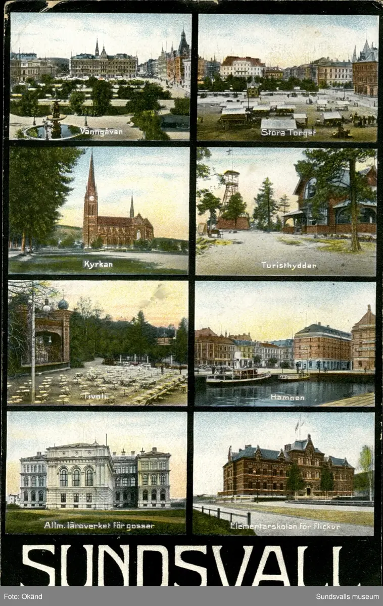 Vykort med motiv över Vängåvan, Stora torget, Kyrkan, Turisthyddan, Tivoli, Hamnen, Allmänna läroverket och Elementärskolan i Sundsvall.